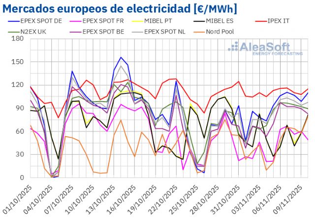 En la semana del 3 de noviembre, los promedios semanales fueron superiores a 75 €/MWh en la mayoría de los mercados eléctricos europeos. Las excepciones fueron los mercados nórdico, francés, español y portugués, cuyos promedios fueron de 43,91 €/MWh, 47,71 €/MWh, 52,50 €/MWh y 53,21 €/MWh, respectivamente. El mercado italiano alcanzó el mayor promedio semanal, de 110,99 €/MWh. En el resto de los mercados analizados en AleaSoft Energy Forecasting, los precios estuvieron entre los 79,81 €/MWh del mercado belga y los 95,39 €/MWh del mercado alemán.