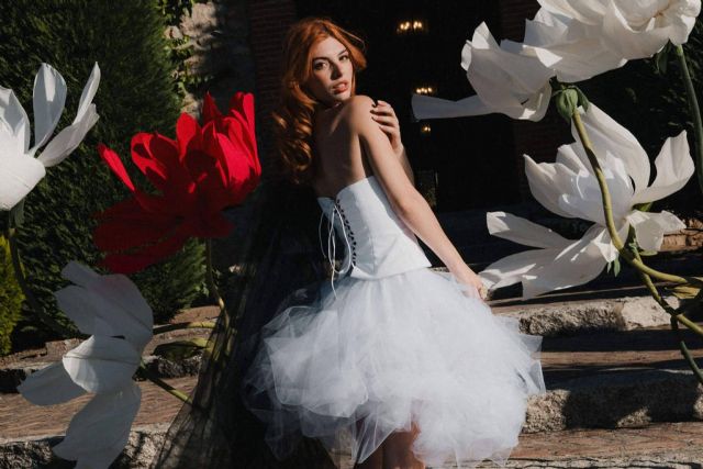 La diseñadora, especializada en alta costura nupcial y creadora de vestidos únicos desde su atelier en Madrid, volvió a demostrar su capacidad para reinterpretar los códigos clásicos del vestido de novia con una mirada actual y valiente. Su propuesta, llevada por @naataliags, fusionó elementos tradicionales, como el corsé, con una falda corta de tul tipo tutú, desenfadada y con un punto alocado, a la que se sumaron tiras de tul negro que aportaron contraste, movimiento y una sofisticación inesperada. Un diseño pensado para novias que deseaban romper con lo establecido sin renunciar a la elegancia. El novio, @jesusortega_, lució un espectacular traje de @lanierioficial.