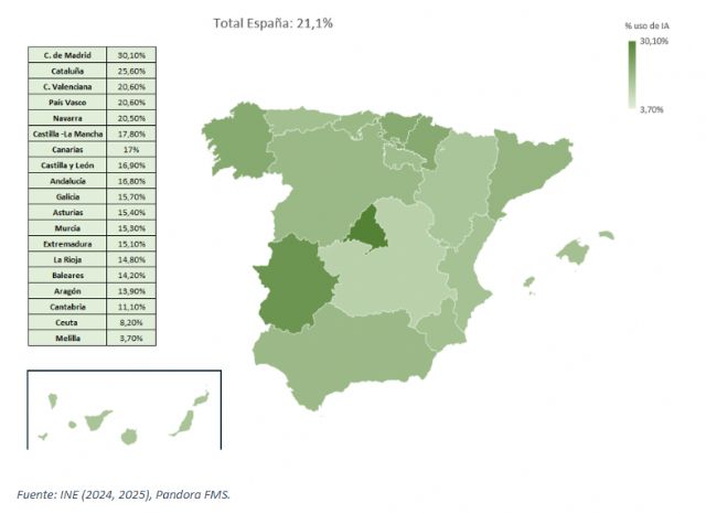 Según los datos del INE analizados por Pandora FMS, en el primer trimestre del 2025 -datos más recientes del instituto público- el 21,1% de las empresas españolas de más de 10 empleados utilizaban Inteligencia Artificial. Una cifra muy superior al 12,4% del mismo periodo del 2024, lo que refleja una tendencia de crecimiento positiva. La Comunidad de Madrid es la principal región con un 30,1% frente al 17,8% del año anterior. Cataluña también muestra gran fuerza en IA con un 25,6% frente al 15,3% previo.