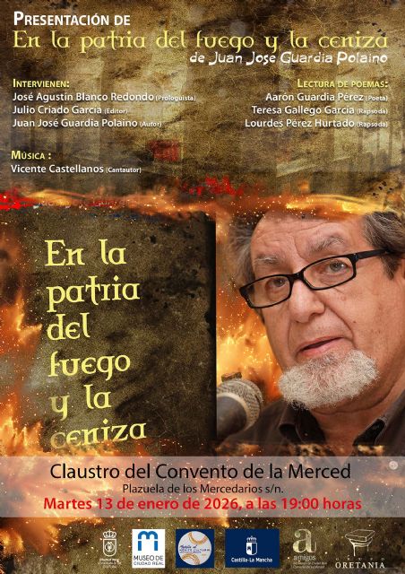 El emblemático claustro del antiguo Convento de la Merced acogerá el próximo martes 13 de enero, a las 19:00 horas, la presentación en Ciudad Real del poemario "En la patria del fuego y la ceniza", obra de Juan José Guardia Polaino publicada por Ediciones C&G (Grupo Oretania). En el evento intervendrán el prologuista José Agustín Blanco Redondo y el editor Julio Criado García. La velada incluirá lecturas poéticas a cargo de Aarón Guardia Pérez, Lourdes Pérez Hurtado y Teresa Gallego García, junto a la actuación musical del cantautor Vicente Castellanos.