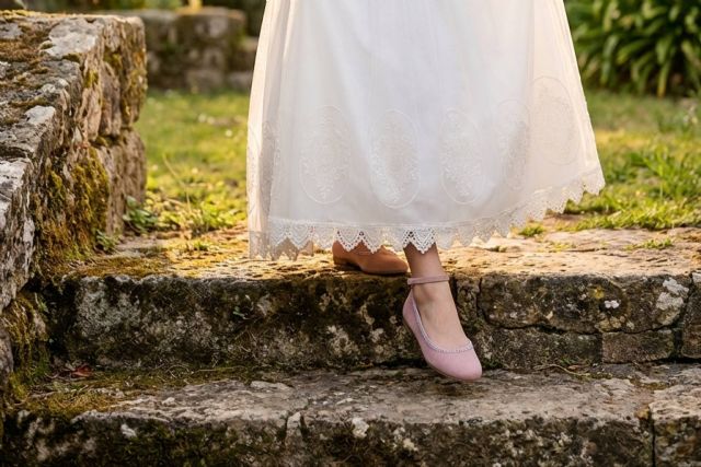 Si algo define la pasarela de 2026 es la "naturalidad sofisticada". Según lo visto en las principales ferias del sector, el blanco nuclear cede paso a los tonos rotos y a una paleta de colores empolvados (verde agua, malva, rosa nude) que tiñen los fajines de los vestidos. Es precisamente en esta armonía cromática donde se han inspirado las nuevas colecciones, diseñando bailarinas de comunión que se integran en el look sin estridencias, como propone la firma Carrilé para esta temporada.