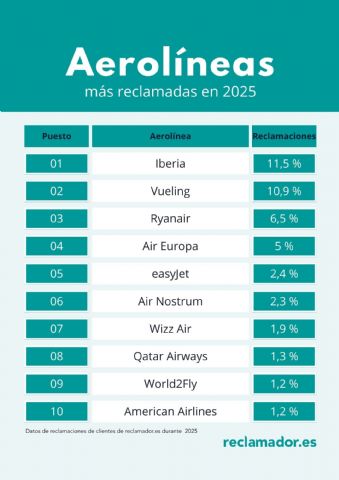 Iberia cerró 2025 como la aerolínea más reclamada por retrasos, cancelaciones de vuelos, overbooking o problemas de equipaje, según datos de reclamador, compañía online líder en reclamaciones aéreas. Esto rompe la tendencia de los últimos años, donde Vueling ocupaba desde el 2022 la primera posición de este ranking. El 11,5 % del total de reclamaciones gestionadas el pasado año por reclamador fueron frente a Iberia, dato que aumenta hasta casi el 15 % si se contabilizan sus dos filiales, Air Nostrum e Iberia Express.