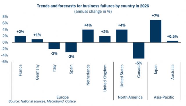 En América del Norte, las trayectorias divergen: en Estados Unidos (+4 %), las empresas seguirán viéndose afectadas por la desaceleración económica y el aumento de los aranceles, y Canadá (-5 %) comenzará un descenso significativo tras un prolongado ciclo de crecimiento. En Asia-Pacífico, Japón (+7 %) seguirá viéndose penalizado por el aumento persistente de los tipos de interés y la vulnerabilidad de varios sectores, mientras que Australia (+0,5 %) debería estabilizarse tras una fuerte normalización postpandemia. Esta dinámica confirma que las perturbaciones locales —monetarias, sectoriales o normativas— seguirán determinando los impagos en 2026.
