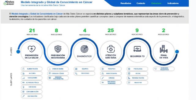El eje central del proyecto es el Modelo integrado y global de conocimiento en cáncer, una herramienta que permite comparar el estado de distintos aspectos del cáncer a lo largo del tiempo y entre las diferentes comunidades autónomas. El modelo analiza indicadores relacionados con la prevención, la actividad asistencial y los recursos disponibles en el ámbito oncológico, siguiendo el itinerario del paciente desde la prevención y el diagnóstico hasta la atención, el seguimiento y el final de vida. Se trata de un modelo orientado a ofrecer una radiografía estructural del sistema oncológico, no a medir resultados en salud, lo que permite identificar desigualdades territoriales y áreas de mejora.