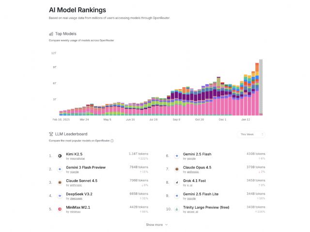 Kimi K2.5 ha mantenido el primer puesto en varios rankings de OpenRouter, incluyendo los de Modelos Top Semanales, Programación, Llamadas a Herramientas y uso específico en Python. Destaca especialmente en el ranking general semanal —el indicador más fiable de la demanda de modelos—, donde alcanzó los 1.16 billones de tokens, superando ampliamente a competidores de código cerrado como Gemini 3 Flash Preview y Claude Sonnet 4.5, con una ventaja superior al 50%.