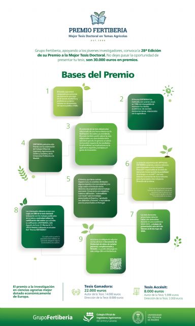 Fertiberia convoca la 28.ª edición del "Premio Fertiberia a la Mejor Tesis Doctoral en Temas Agrícolas", una iniciativa orientada a impulsar el talento investigador y a poner en valor el conocimiento científico aplicado al desarrollo del sector agroalimentario.
