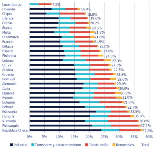 En la media de la UE, el 27,3% de los trabajadores está ocupado en alguno de los sectores que resultan clave para la transición medioambiental: industria, transporte y almacenamiento, construcción o energías renovables. En España el porcentaje es del 24%, por lo que existe una brecha de 3,3 puntos porcentuales para que el país alcance el nivel de ocupación en estos sectores de la media europea, según el informe Transformación energética sostenible y empleo, elaborado por Randstad Research.