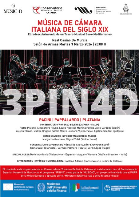 Después de la experiencia desarrollada en la ciudad de Pescara, ahora le toca el turno al proyecto impulsado por el Conservatorio Vincenzo Bellini de Catania dentro del programa "3PIN4D", integrado en "MUSIC4D", una iniciativa financiada por el Plan Nacional de Recuperación y Resiliencia (PNRR) de la Unión Europea y respaldada por el Ministero dell'Università e della Ricerca.