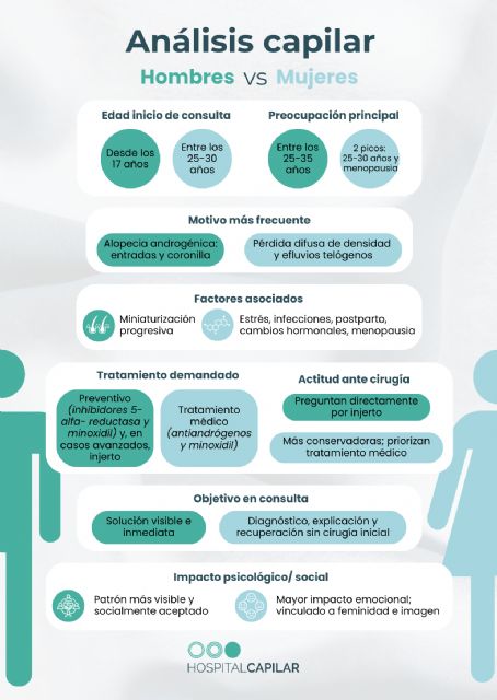 En hombres, la preocupación suele iniciarse entre los 25 y los 35 años, aunque el proceso puede haber comenzado antes. Mientras tanto, en mujeres, desde Hospital Capilar observan dos picos claros: uno entre los 25-30 años (caídas reaccionales o inicio de alopecia femenina) y otro a partir de la menopausia.