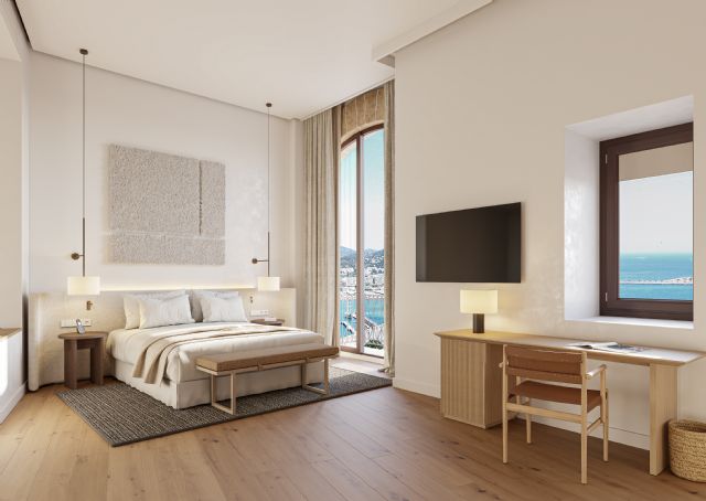 Las zonas interiores, cuidadosamente estudiadas y proyectadas, combinan materiales contemporáneos de alta calidad con texturas y acabados que evocan la piedra, la luz, la artesanía y el color del Mediterráneo. El tratamiento de la luz natural -potente y cambiante como la propia isla-, la paleta cromática cálida y la selección de mobiliario elegante y funcional contribuyen a crear una atmósfera que respira calma, sofisticación y respeto por el contexto patrimonial histórico.