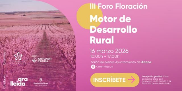 Aitona será el escenario el próximo 16 de marzo del III Foro Floración: Motor de Desarrollo Rural, un encuentro que reunirá a representantes institucionales, expertos, alcaldes y profesionales vinculados al turismo y al sector primario para analizar el papel de la floración como recurso estratégico para el desarrollo de los territorios rurales.