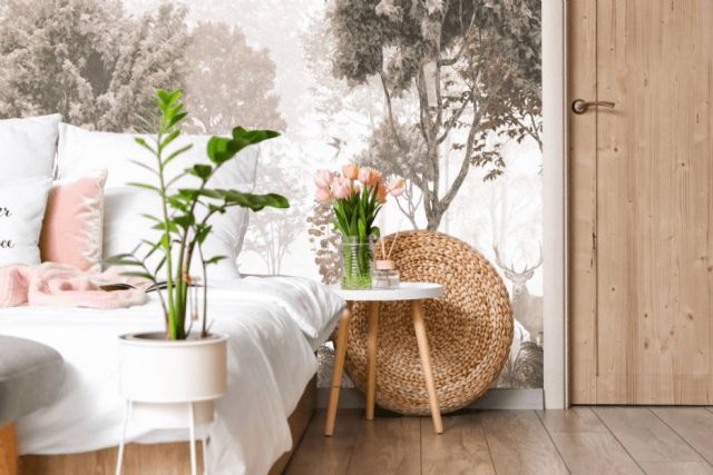 En zonas de estudio o trabajo, un papel pintado de estilo geométrico o abstracto aporta orden visual y energía sin saturar el entorno. Por su parte, la pared trasera de la cama puede actuar como punto focal en el dormitorio, añadiendo profundidad y carácter sin grandes cambios.