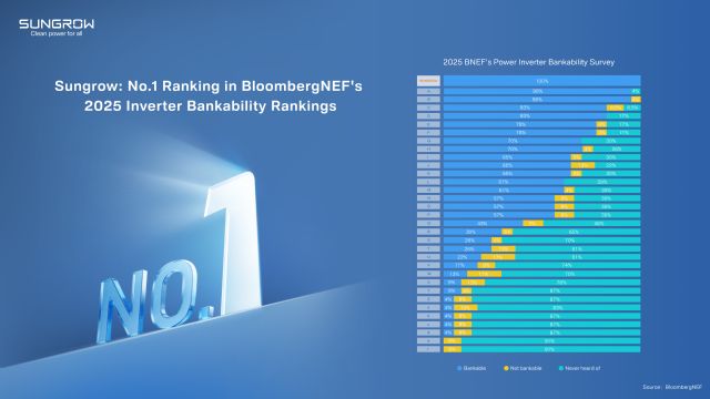 Sungrow, proveedor líder mundial de inversores fotovoltaicos y sistemas de almacenamiento de energía (ESS), ha vuelto a ser nombrada la empresa número uno en bancabilidad a nivel mundial en la encuesta sobre bancabilidad de inversores 2025 de BloombergNEF (BNEF), con un reconocimiento del 100% en las respuestas a la encuesta. Esta es la sexta vez que Sungrow obtiene el prestigioso primer puesto, lo que refuerza su liderazgo en el sector y la confianza inquebrantable en sus productos en el mercado mundial de las energías renovables.