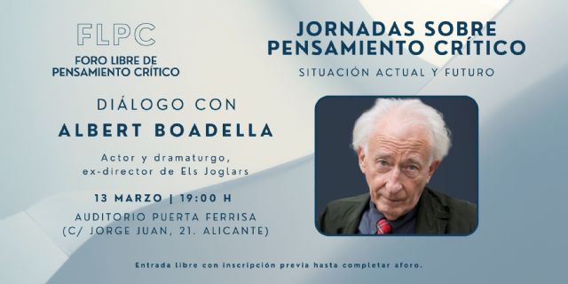 El Foro Libre de Pensamiento Crítico celebrará este viernes 13 de marzo un diálogo con Albert Boadella, actor y dramaturgo, exdirector de la compañía de teatro independiente Els Joglars.