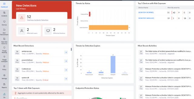 Detección de amenazas impulsada por IA: Utiliza análisis de comportamiento e inteligencia artificial para detectar amenazas avanzadas y difíciles de identificar, como malware sin archivos o ataques que aprovechan herramientas legítimas del propio sistema. Esto permite detectar y frenar los ataques en fases tempranas, reduciendo su posible impacto en la empresa.