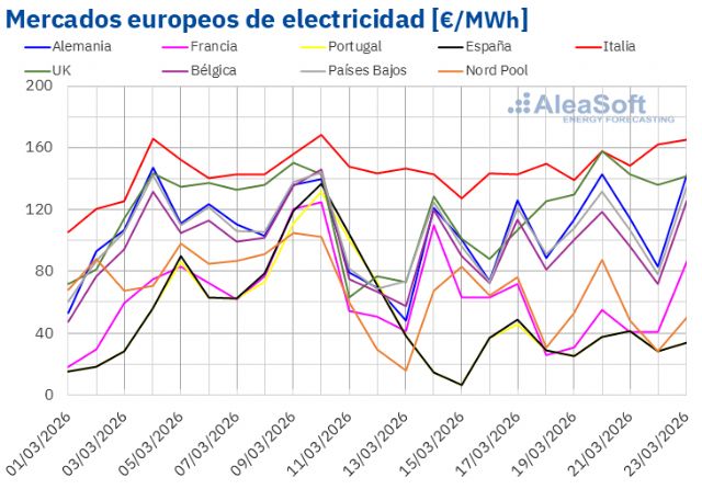 En la semana del 16 de marzo, los promedios semanales superaron los 90 €/MWh en la mayoría de los mercados eléctricos europeos. Las excepciones fueron los mercados portugués, español, francés y nórdico, cuyos promedios fueron de 34,83 €/MWh, 35,32 €/MWh, 46,90 €/MWh y 55,39 €/MWh, respectivamente. El mercado italiano registró el mayor promedio semanal, de 149,04 €/MWh. En el resto de los mercados analizados en AleaSoft Energy Forecasting, los precios estuvieron entre los 93,49 €/MWh del mercado belga y los 126,57 €/MWh del mercado británico.