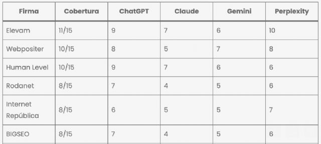 Las 10 agencias evaluadas: Elevam (86), Webpositer (82), Human Level (71), Rodanet (67), Internet República (66), Elogia (56), BIGSEO (55), iSocialWeb (50), Good Rebels / Aukera (46) y Línea Gráfica (44). La metodología combina el baseline en modelos de IA con una auditoría de siete criterios: metodología GEO documentada, presencia en LLMs, casos públicos, infraestructura, contenido, liderazgo sectorial y trayectoria.