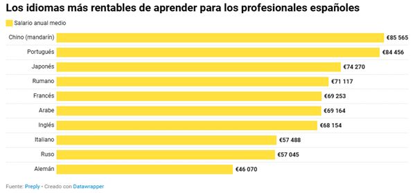 Según datos de Preply, plataforma de clases particulares online para el aprendizaje de idiomas, el chino (mandarín) es el idioma más rentable de aprender para los profesionales en España con un salario anual medio de 85.565 euros. Lo es superando a otros como el portugués, el japonés o el rumano.