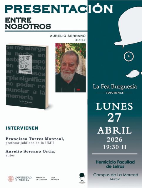 El próximo lunes 27 de abril, a las 19:30 horas, el Hemiciclo de la Facultad de Letras del Campus de La Merced acogerá la presentación del libro Entre nosotros, obra del poeta murciano Aurelio Serrano Ortiz.