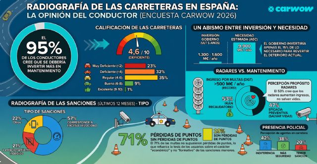 Carwow, el principal marketplace de vehículo nuevo en España y Europa, ha publicado los resultados de su última consulta sobre seguridad vial e infraestructuras. El dato es llamativo: el 95% de los conductores encuestados considera que hay una clara descompensación entre la inversión en conservación de las carreteras y la inversión en radares.