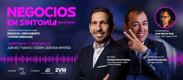 El primer programa de esta tercera temporada se grabará el próximo jueves día 7 de mayo a partir de las 9:30h; y contará con la presencia de Carlos Pena Pastor, Associate Director de CBRE, líder mundial en consultoría y servicios Forbes Best Reputation 2026, firma responsable de la gestión y comercialización del nuevo ecosistema Myrtea, un ambicioso proyecto que integra: empresa, formación, ocio y servicio.