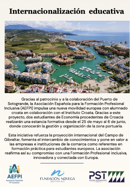 Puerto Deportivo Sotogrande será empresa receptora de una nueva movilidad europea promovida por la Asociación Española para la Formación Profesional Inclusiva (AEFPI), en colaboración con el Instituto Croata, en el marco de un proyecto orientado a reforzar la internacionalización, la educación y la conexión entre formación y empresa en el Campo de Gibraltar.