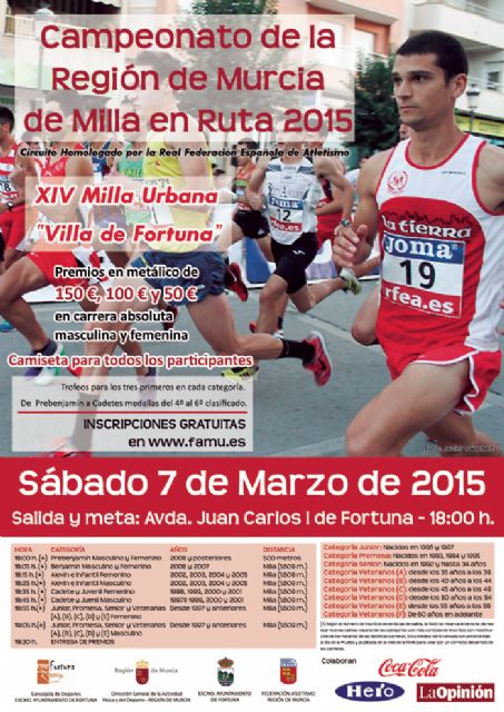 Los mejores especialistas en el mediofondo de la región tienen una cita clave el próximo sábado 7 de marzo. La Avenida Juan Carlos I de Fortuna acogerá la salida y meta de la XIV Milla Urbana “Villa de Fortuna”, que albergará asimismo por tercer año consecutivo el Campeonato de la Región de Murcia de Milla en Ruta. La cita, organizada por el Excmo. Ayuntamiento de Fortuna y la Federación de Atletismo de la Región de Murcia, arrancará a partir de las 18:00h.