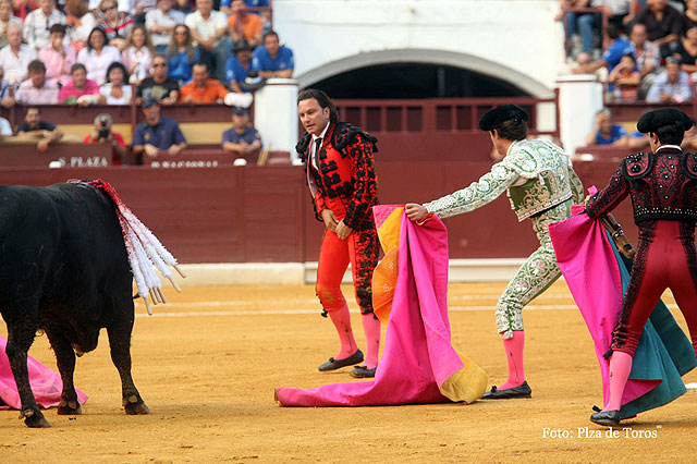 |< < Foto 8 / 13 > >| José Tomás y Tejela cortan dos orejas y leve cogida de Julio Aparicio Plaza de Toros de Murcia (Prohibida la reproducción total o parcial sin el consentimiento del autor) 18/09/2009 Volver a la noticia