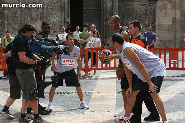 El CB Murcia graba un anuncio frente a la Catedral para captar abonados