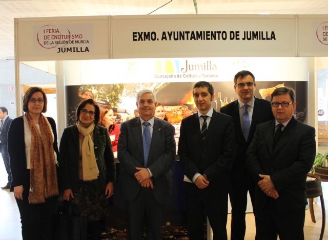 El alcalde de Jumilla, Enrique Jiménez, acompañado de la responsable de Cultura y Turismo, María Dolores Fernández, y los concejales Alicia Abellán y Ramiro García Cerezo, asistían esta mañana a la inauguración de I Feria de Enoturismo de la Región de Murcia, que ha estado presidida por el consejero de Cultura y Turismo, Pedro Alberto Cruz, y que se desarrollará hasta el próximo lunes, 3 de marzo, en el Auditorio y Centro de Congresos 'Victor Villegas' de Murcia, tomando como el hilo conductor las rutas del vino de Jumilla, Yecla y Bullas, certificadas por la Asociación Española de Ciudades del Vino (ACEVIN) e incluidas en las Rutas del Vino de España.