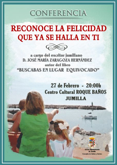 El viernes, 27 de febrero, a las 20:00 horas, en el Centro Socio Cultural Roque Ban~os de Jumilla, se realizará la charla "Reconoce la felicidad que ya se halla en ti". El escritor jumillano José´ María Zaragoza Hernández, autor del libro "Buscabas en lugar equivocado", mostrara´ como la felicidad es un estado de ser que ya poseen las personas en su interior por lo que según indica "no tenemos que buscar fuera ni luchar por conseguirla".