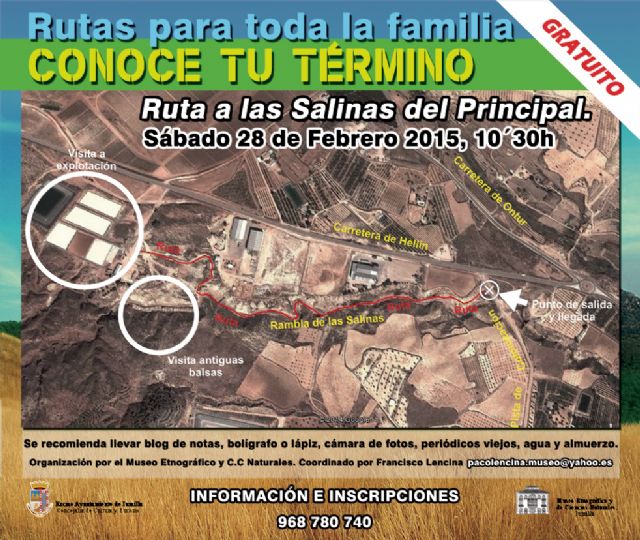 La actividad está coordinada por uno de los mantenedores del Museo de Etnografía y Ciencias de la Naturaleza, Francisco Lencina, y se iniciará, este sábado, 28 de febrero. La primera salida se realizará a las 10.30 horas, hacia las Salinas del Principal, donde se visitarán las antiguas balsas y la explotación. Las inscripciones se podrán formalizar a través del teléfono 968 78 07 40.
