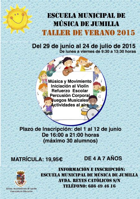 La Concejalía de Educación, a través de la Escuela Municipal del Música de Jumilla, ha organizado como cada año, un taller de verano, para niños y niñas de entre 4 y 7 años, que quieran adentrarse en el mundo de la música, de una forma divertida a la par que educativa.