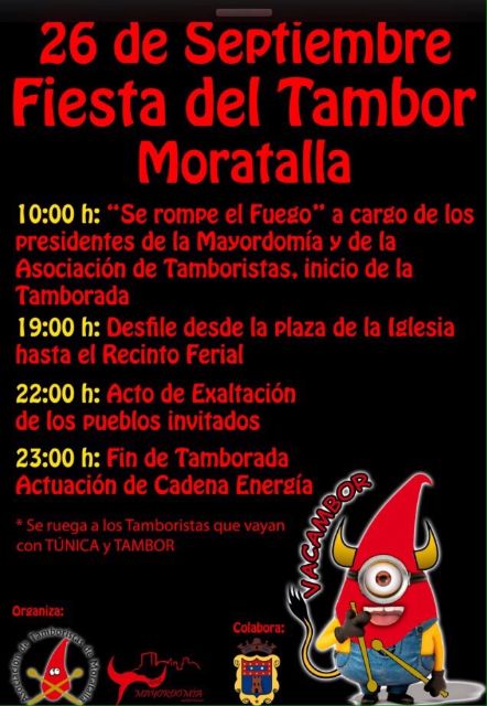 El evento da comienzo a las 10 de la mañana con el acto 'Se rompe el fuego', con el que se da por inaugurada la tamborada. A las 19.00 horas está previsto el desfile desde la plaza de la Iglesia hasta el recinto ferial. A las 22 horas se realizará el acto de exaltación de los pueblos invitados, entre los que se encuentra Jumilla, finalizando la actividad a las 23 horas.