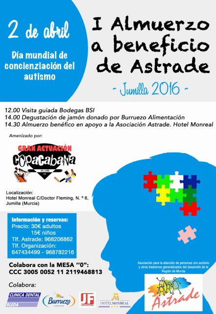 La Asociación para la Atención de Personas con Trastornos generalizados del Desarrollo de la Región de Murcia, Astrade, va a celebrar este sábado en Jumilla varias actividades con motivo del Día Mundial de concienciación contra el Autismo.