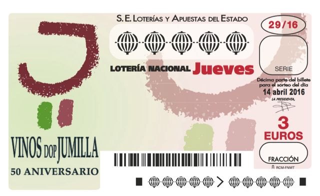 El Consejo Regulador de la Denominación de Origen Protegida Vinos de Jumilla protagoniza los décimos de la Lotería Nacional del sorteo de mañana, 14 de abril. Los décimos, que se encuentran a la venta desde hace días, lucen el logotipo del Consejo con motivo del 50º aniversario de su creación y coincidiendo en fecha con el desarrollo del XXII Certamen de Calidad de los Vinos de Jumilla, que se desarrolla mañana jueves y el viernes en el Museo Regional del Vino 'El arsenal' de Jumilla.