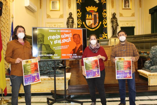La concejala de Cultura, Pilar Martínez, junto a Jacobo Herrero y Bartolomé Medina, en representación del CineClub Séptimo Sótano, han presentado esta mañana un que se podrá disfrutar de forma gratuita y con todas las medidas covid durante esta Navidad en el Auditorio del Conservatorio de Música.