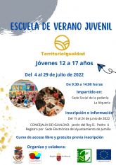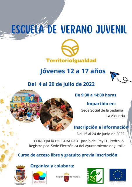 Desde hoy y hasta el 24 de junio está abierto el plazo de inscripciones para participar en la segunda edición de la Escuela de Verano Juvenil de La Alquería, organizada por ADC Nordeste de a Región de Murcia y la Concejalía de Igualdad, financiada por fondos Leader y enmarcada en el proyecto Territorio en Igualdad.