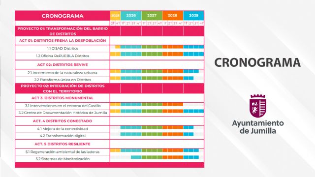 Por otro lado, el proyecto de Integración de Distritos en el Territorio garantizará la conexión física y digital de estas zonas con el resto de la ciudad, reforzando su identidad histórica y mejorando la sostenibilidad ambiental con la recuperación de espacios verdes y la regeneración del entorno del Castillo de Jumilla.