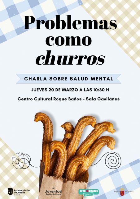 El jueves, 20 de marzo, comenzará con la charla Problemas como Churros, impartida por Didier García, psicólogo del área de Juventud del Ayuntamiento de Jumilla, estará enfocada a la salud mental juvenil y tendrá lugar a las 10:30 horas en el Centro Sociocultural Roque Baños.