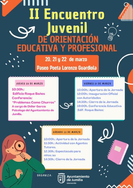 El Ayuntamiento de Jumilla, a través de las Concejalías de Educación y Juventud, organiza el II Encuentro Juvenil de Orientación Educativa y Profesional, que se celebrará del 20 al 22 de marzo en el Paseo Poeta Lorenzo Guardiola de Jumilla.