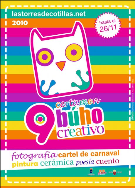 El certamen "Búho Creativo" de Las Torres de Cotillas presenta su novena edición, en la que un año más convoca a los jóvenes creadores de nuestra región para que demuestren su talento, imaginación y destreza. Convocado de nuevo por la Concejalía de Juventud torreña y el Instituto de la Juventud de la Región de Murcia, este concurso artístico se divide en seis modalidades: cuento, fotografía, poesía, cartel de carnaval, cerámica y pintura.