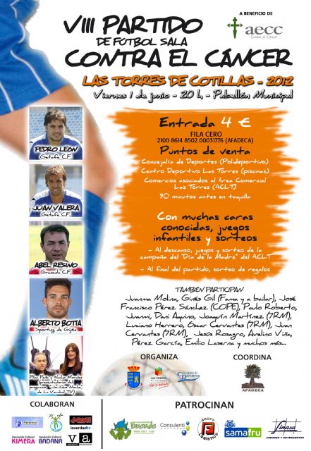 Todos unidos un año más contra el cáncer. Así estarán los vecinos y visitantes de Las Torres de Cotillas mañana viernes 1 de junio durante la celebración del "VIII Partido de fútbol sala contra el Cáncer" del municipio (20 horas, Pabellón Municipal), a beneficio de la Asociación Española Contra el Cáncer (AECC) y organizado por la Concejalía de Deportes torreña en colaboración con la Asociación de Famosos y Deportistas contra el Cáncer (AFADECA). Un evento que contará con un cartel de lujo que estará encabezado por los futbolistas murcianos Pedro Léon y Juan Valera (Getafe C. F.), y Alberto Botía (Sporting de Gijón).
