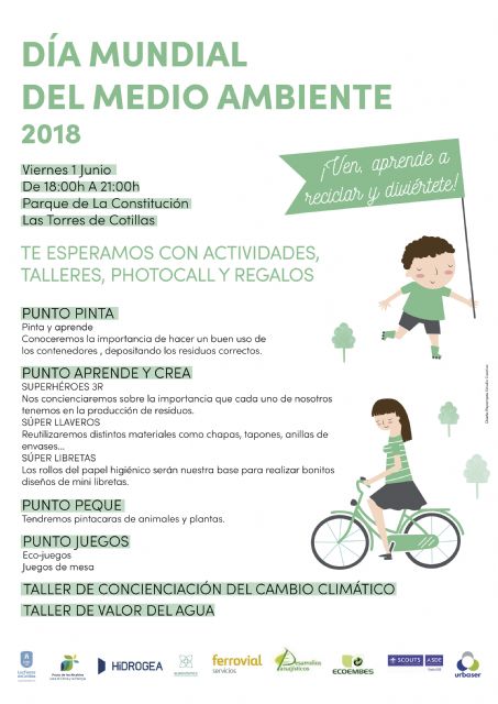 El Ayuntamiento de Las Torres de Cotillas ya tiene preparada, un año más, una gran jornada de actividades para celebrar por todo lo alto el 'Día del Medio Ambiente'. "Será mañana viernes 1 de junio (17 horas) en el Parque de la Constitución y se ha preparado una tarde para disfrutar con toda la familia, donde los protagonistas más destacados serán los más pequeños", señala la alcaldesa Isabel María Zapata, que adelanta que se realizarán diversas propuestas gratuitas: talleres de reciclaje, photocall del residuo, actividades de concienciación sobre cambio climático, juegos y reparto de flor de temporada.
