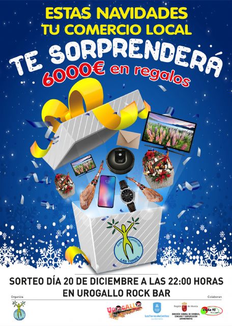 'Estas Navidades tu comercio local te sorprenderá'. Con este lema el Área Comercial Las Torres (ACLT) ha puesto en marcha una nueva edición de su campaña de Navidad en la que un año más sorteará premios entre sus clientes. Así, las personas que hagan sus compras en los comercios de esta asociación de Las Torres de Cotillas podrán ganar 6.000 euros en regalos. "Sortearemos televisores, relojes, móviles, robots aspiradores, cestas de Navidad, jamones, cenas…", indica Mª Carmen Ballester, presidenta del ACLT, que invita a sus vecinos "a consumir en el comercio local y a disfrutar de su trato directo y cercano".