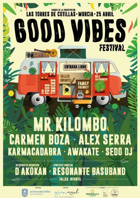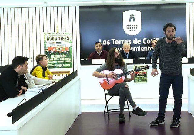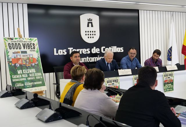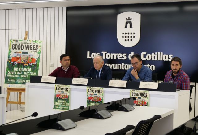 El Ayuntamiento de Las Torres de Cotillas celebrará el próximo sábado 25 de abril en el parque de la Constitución el festival Good Vibes, que ofrecerá actividades para toda la familia con asistencia libre y gratuita. Esta cita, concebida como una feria de día para todas las edades que contará con 15 horas de música y actividades, ha sido presentada hoy miércoles 19 de febrero en un acto presidido por el alcalde torreño, Joaquín Vela Fernández, y los concejales de Festejos, Francisco José Caravaca Bravo, y de Cultura, Antonio Contreras Martínez. "Se trata de un festival pensado para pasar un día de fiesta al aire libre con nuestros seres queridos, familia y amigos, con propuestas que gusten a pequeños y mayores donde la música será la principal protagonista", explica el primer edil.