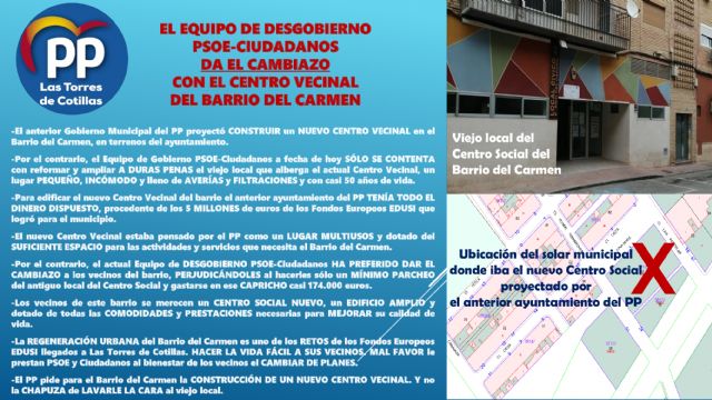 Igualmente, los populares torreños han desarrollado una campaña de buzoneo informativo en el barrio para transmitir a sus habitantes su propuesta de construcción de un amplio y buen equipado Centro Multiusos que, contemplado por el anterior Gobierno Municipal del PP y desechada por el actual ayuntamiento dirigido por PSOE y Ciudadanos, estaba financiada en su totalidad con cargo a los Fondos Europeos EDUSI que el Partido Popular local logró en 2018 para modernizar Las Torres de Cotillas en materia de equipamientos, servicios e infraestructuras.