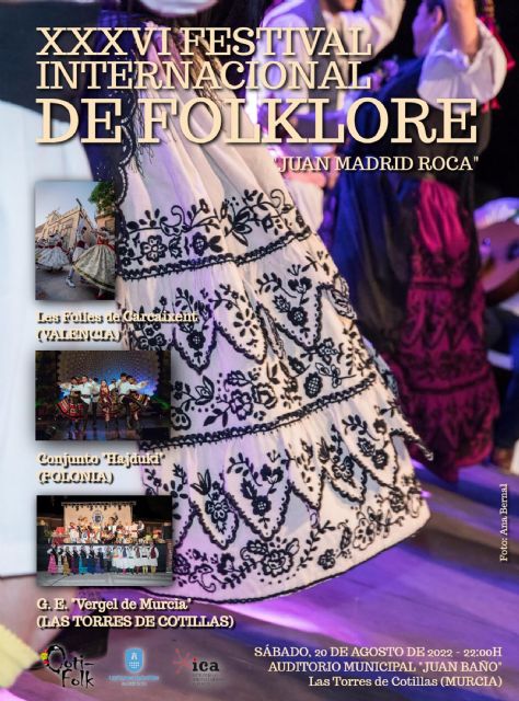 El Festival Internacional de Folklore "Juan Madrid Roca" de Las Torres de Cotillas celebrará este año su 36ª edición, una vez más en el marco de las fiestas del municipio. Será el próximo sábado 20 de agosto (22:00 horas) en el auditorio municipal "Juan Baño", en una velada con asistencia gratuita que reunirá a dos grupos españoles y uno polaco.