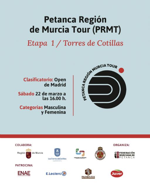 Las pistas municipales del polígono industrial San Jorge de Las Torres de Cotillas acogerán el próximo sábado 22 de marzo (16:00 horas) la primera etapa del Petanca Región de Murcia Tour 2025. Se trata del circuito regional organizado por la Federación Murciana de Petanca (FMP), que en esta prueba contará con la colaboración de la Concejalía de Deportes torreña y el club Petanca La Salceda.