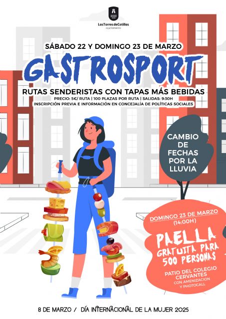 Las lluvias obligaron a posponer varios de los actos de la programación de la Concejalía de PolíticasSociales de Las Torres de Cotillas para celebrar el 8 de marzo, día internacional de la mujer. Así, finalmente las rutas GastroSport se celebrarán este sábado 22 y domingo 23 de marzo, dos rutas a pie por el municipio en las que aprovechar para degustar tapas más bebidas en establecimientos locales. Con 100 plazas en cada ruta, ambos días la salida será a las 9:30 horas.